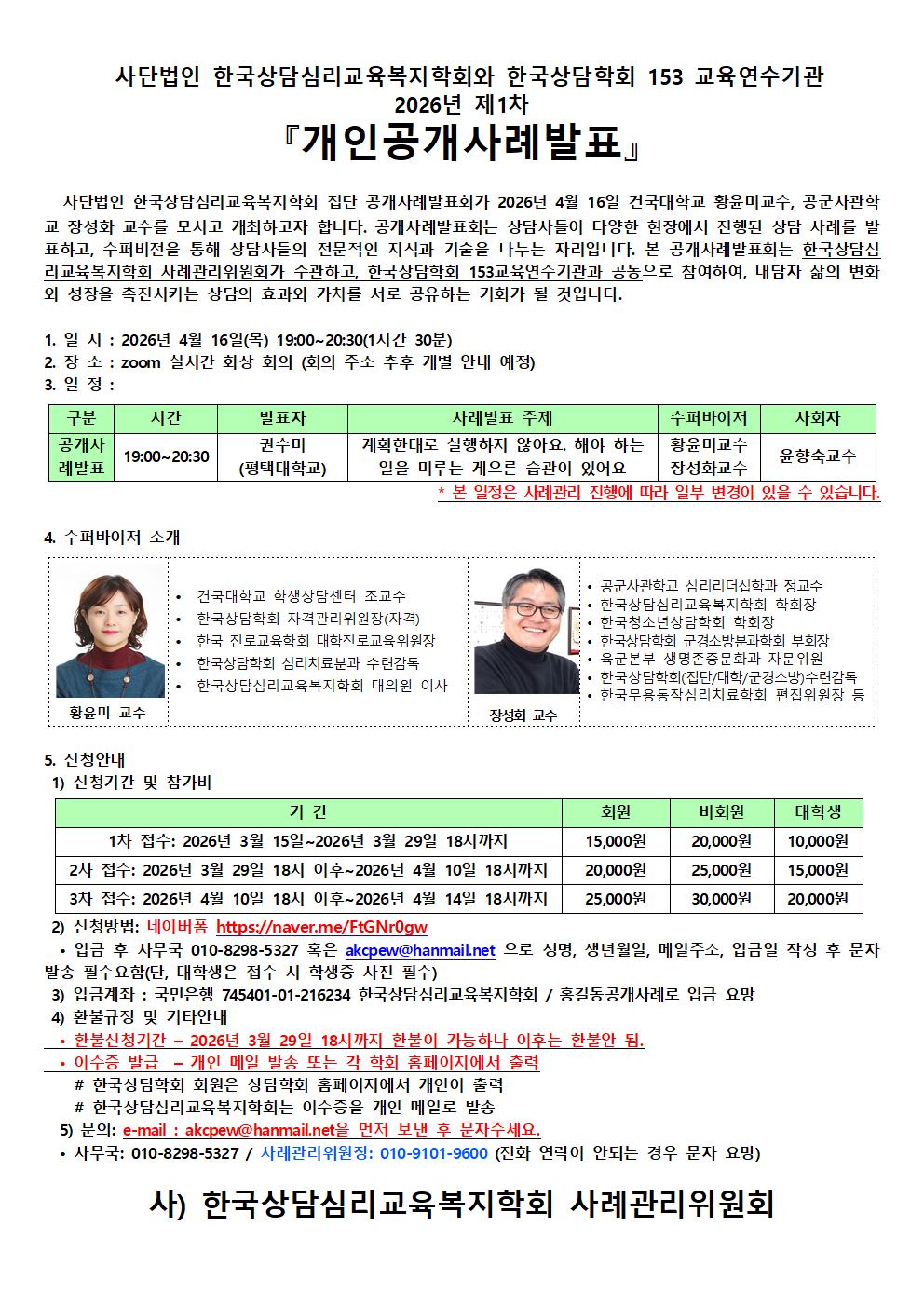 »ç´Ü¹ýÀÎ Çѱ¹»ó´ã½É¸®±³À°º¹ÁöÇÐȸ Áý´Ü °ø°³»ç·Ê¹ßǥȸ°¡ 2026³â 4¿ù 16ÀÏ °Ç±¹´ëÇб³ ȲÀ±¹Ì±³¼ö, °ø±º»ç°üÇб³ Àå¼ºÈ ±³¼ö¸¦ ¸ð½Ã°í °³ÃÖÇϰíÀÚ ÇÕ´Ï´Ù. °ø°³»ç·Ê¹ßǥȸ´Â »ó´ã»çµéÀÌ ´Ù¾çÇÑ ÇöÀå¿¡¼ ÁøÇàµÈ »ó´ã »ç·Ê¸¦ ¹ßÇ¥Çϰí, ¼öÆÛºñÀüÀ» ÅëÇØ »ó´ã»çµéÀÇ Àü¹®ÀûÀÎ Áö½Ä°ú ±â¼úÀ» ³ª´©´Â ÀÚ¸®ÀÔ´Ï´Ù. º» °ø°³»ç·Ê¹ßǥȸ´Â Çѱ¹»ó´ã½É¸®±³À°º¹ÁöÇÐȸ »ç·Ê°ü¸®À§¿øÈ¸°¡ ÁÖ°üÇϰí, Çѱ¹»ó´ãÇÐȸ 153±³À°¿¬¼ö±â°ü°ú °øµ¿À¸·Î Âü¿©ÇÏ¿©, ³»´ãÀÚ »îÀÇ º¯È¿Í ¼ºÀåÀ» ÃËÁø½ÃŰ´Â »ó´ãÀÇ È¿°ú¿Í °¡Ä¡¸¦ ¼·Î °øÀ¯ÇÏ´Â ±âȸ°¡ µÉ °ÍÀÔ´Ï´Ù.